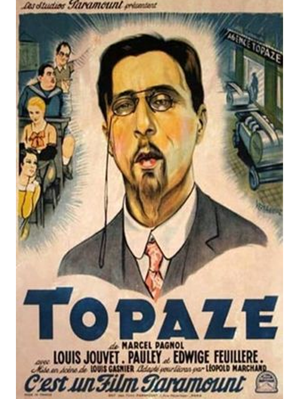 Chef d’oeuvre mais adaptation pourtant haïe par son auteur, Marcel Pagnol, qui reprochera à Louis Gasnier d’avoir sacrifié son texte – reproches qui lui vaudront une brouille et une séparation avec la Paramount – Topaze marque les débuts et le succès de sa tête d’affiche, Louis Jouvet, à jamais dans les mémoires pour sa célèbre dictée, et sa prononciation inégalée. Un régal que ne dépasseront pas les deux versions suivantes (1936, 1951), réalisées, elles, par le cinéaste et auteur marseillais.